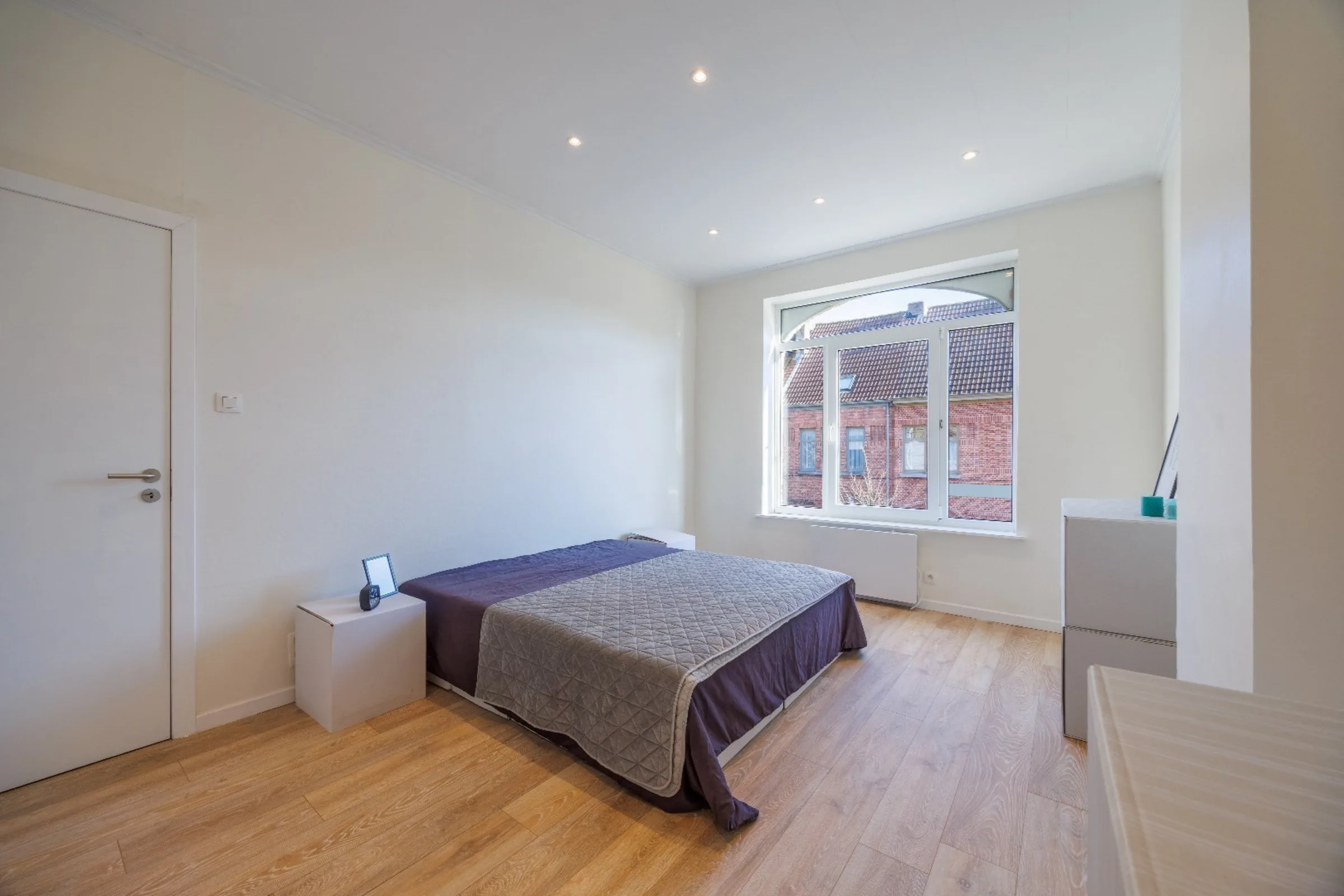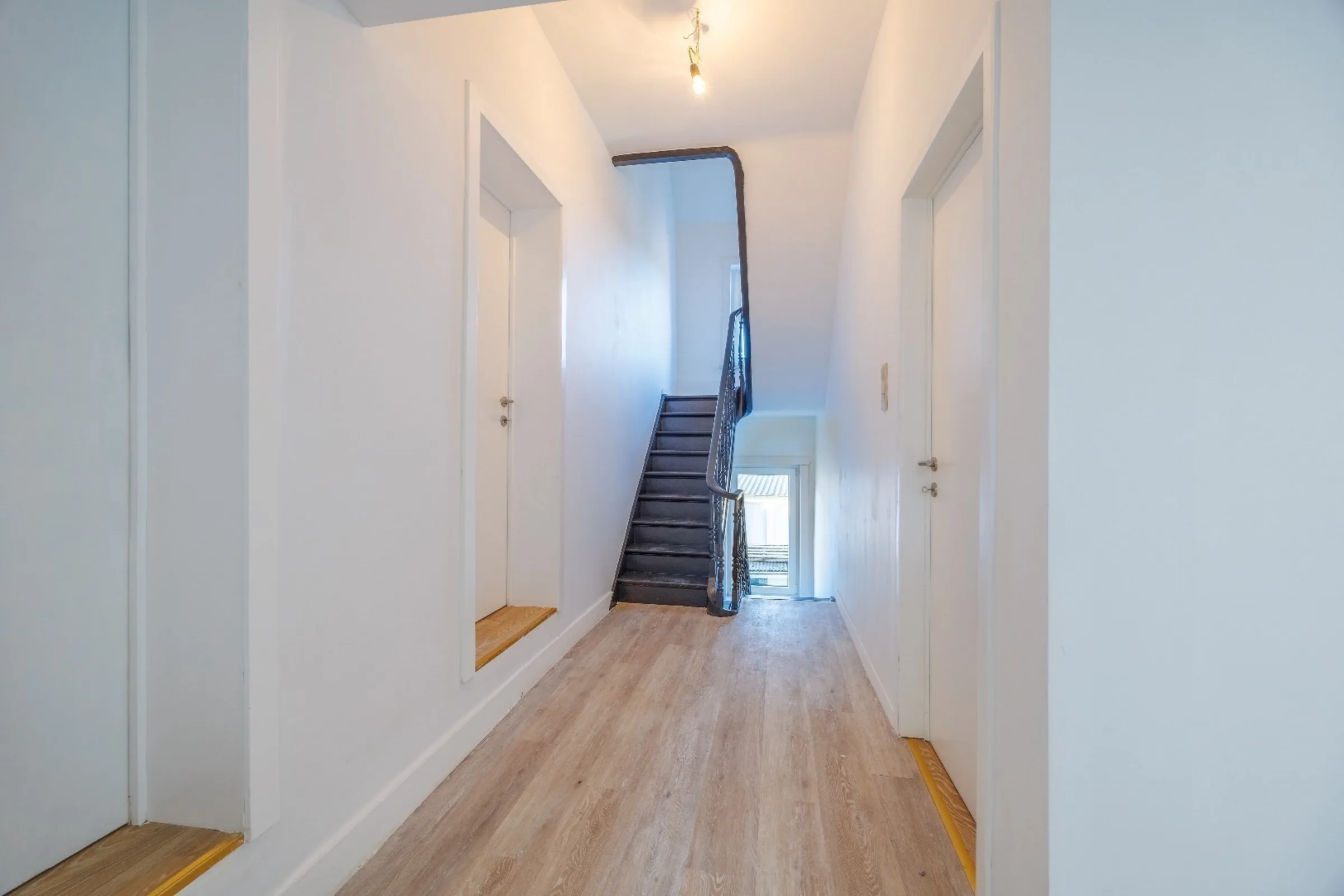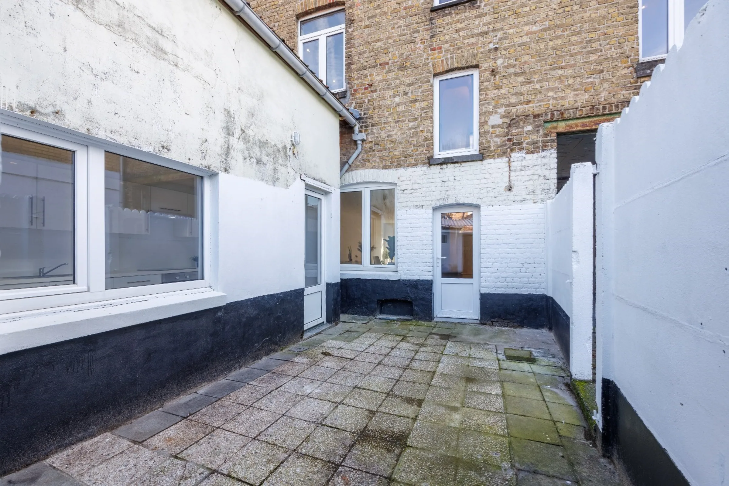 De charmante, recent gerenoveerde gevel verwelkomt je in de inkomhal met terrazzo vloer. Van hieruit kom je in de lichtrijke leefruimte en de keuken met zicht op de koer. Achteraan is er een apart toilet.