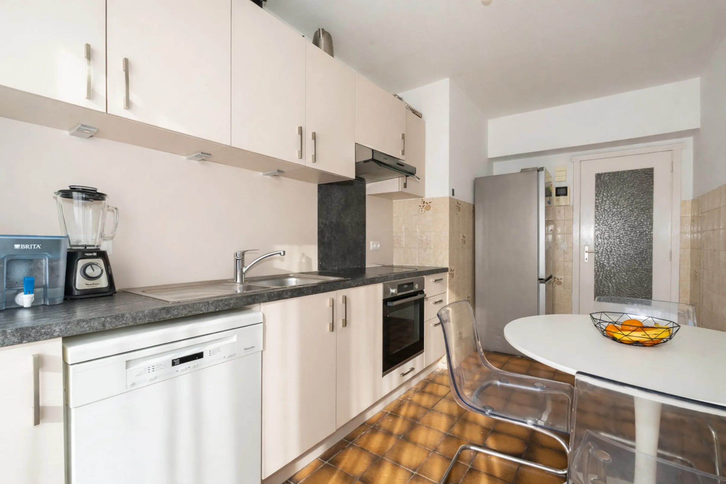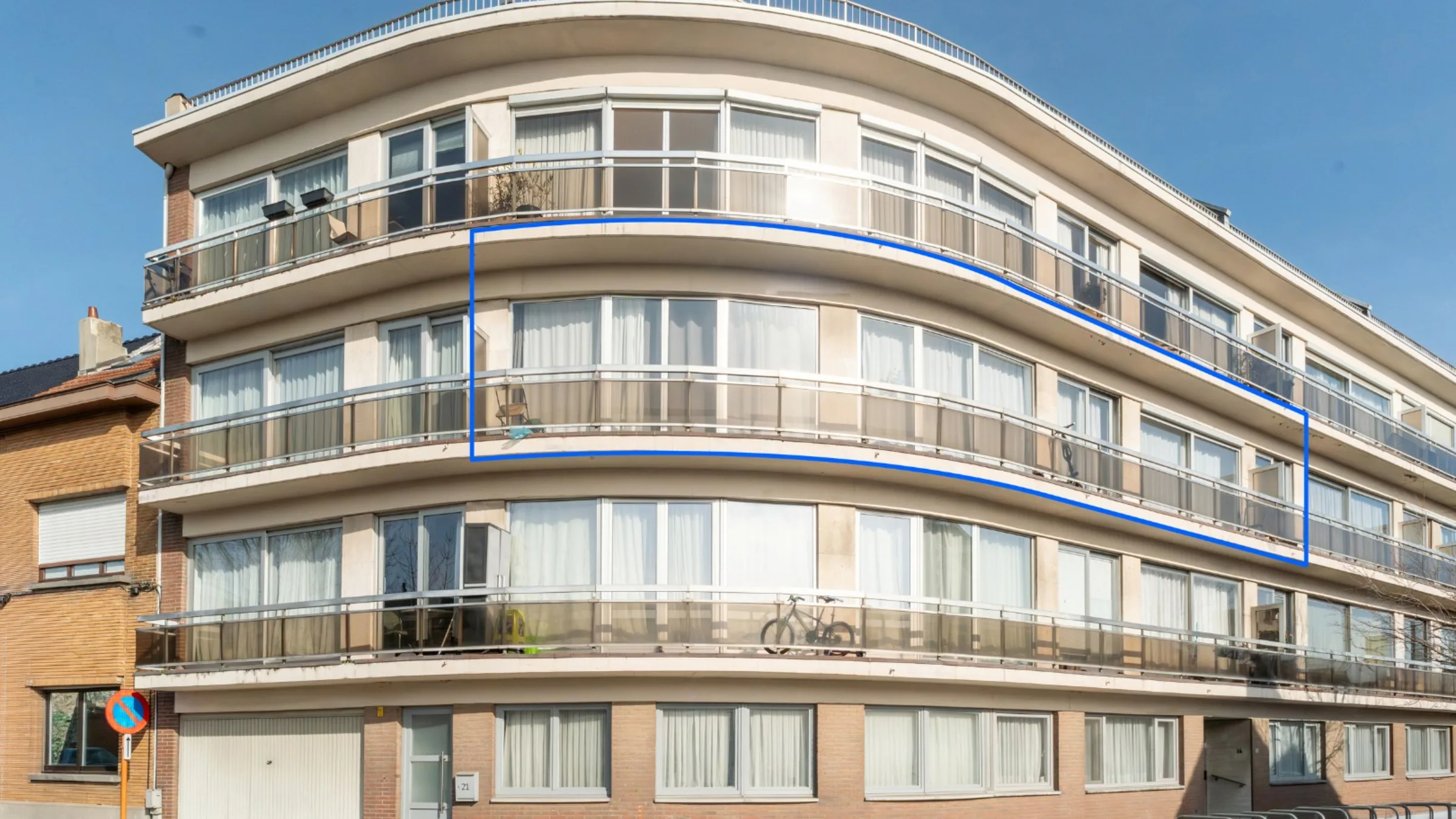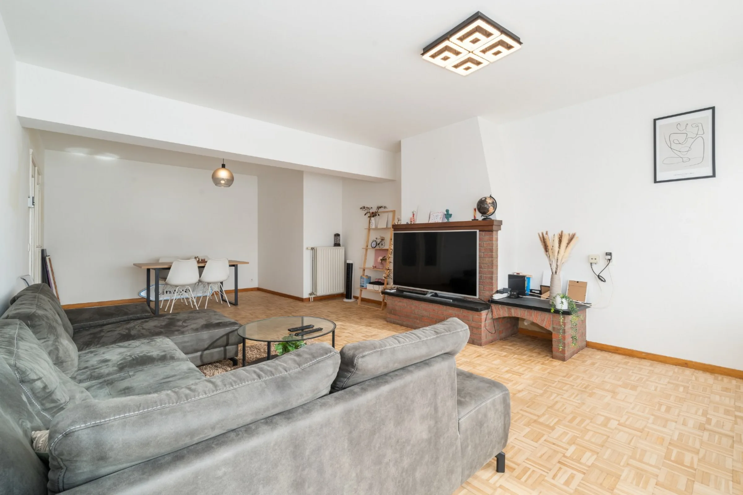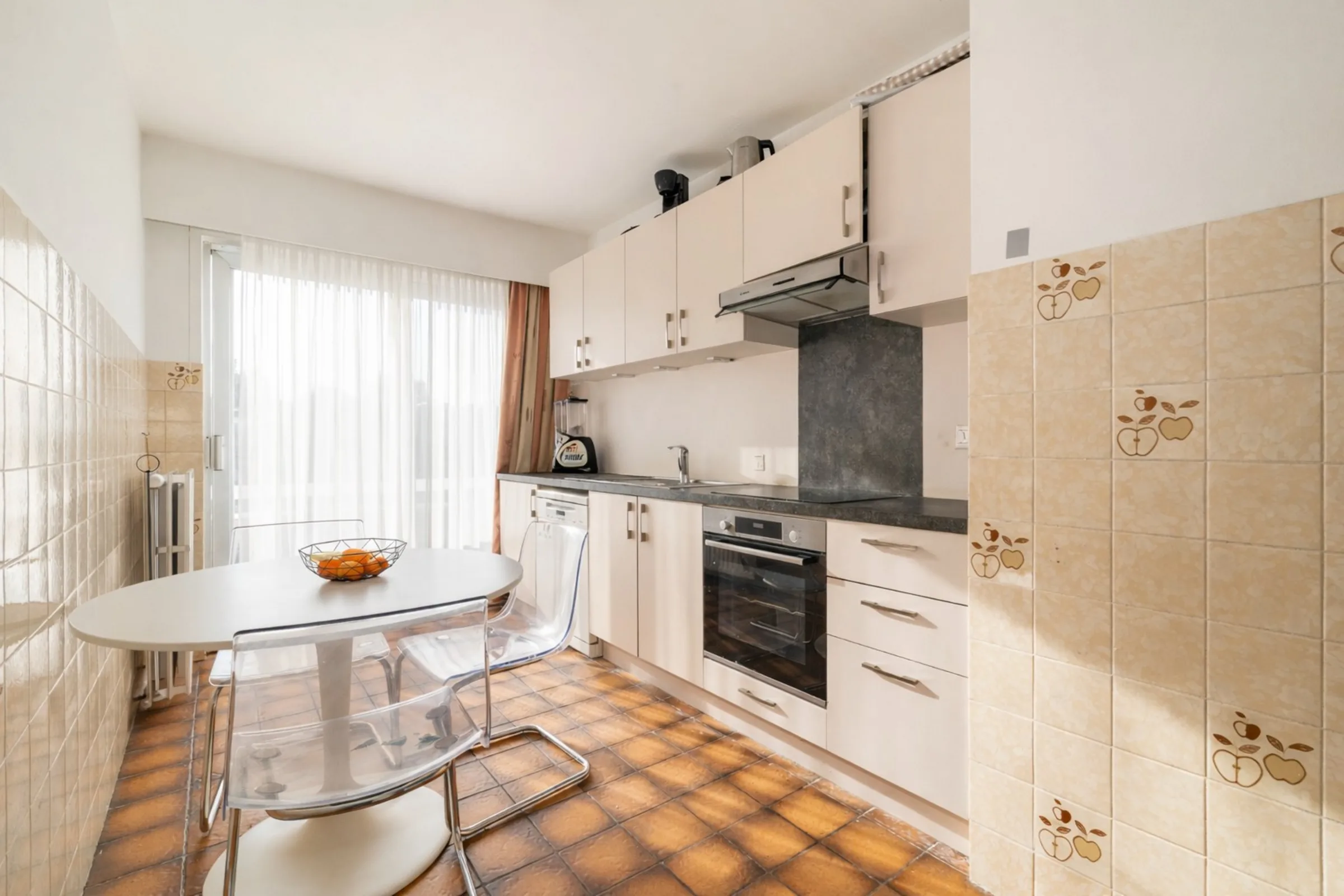 Het appartement werd enkele jaren geleden grondig opgefrist en wordt vandaag bewoond door een correcte huurder die het pand met zorg behandelt. De royale ruimtes en overvloedige lichtinval zorgen voor een aangename woonbeleving. Via de inkomhal met gastentoilet en vestiaire kom je in de leefruimte met massieve parketvloer, waar plaats is voor een grote zithoek en eettafel. De afzonderlijke keuken is praktisch ingericht en biedt alle nodige comfort.